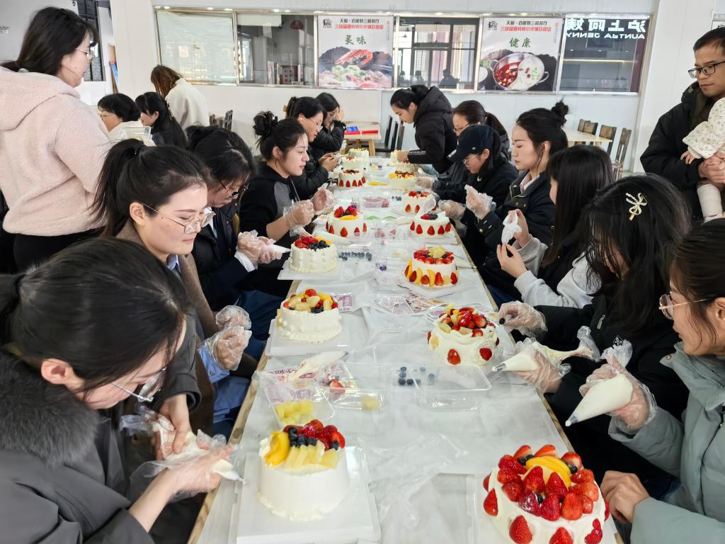 “范老师,你做蛋糕好好看”“张老师,你的蛋糕超级有食欲”……一个个小小的蛋糕胚,在一双双巧手的操作下,将一个个红彤彤的草莓、甜甜的蓝莓、菠萝、黄桃等水果进行精心摆放,再加上奶油的裱花、糖果的装饰,一个个独属于每位坚守在教学、管理岗位一线女职工的节日蛋糕制作完成啦!活动过程中每位老师的脸上洋溢着快乐、幸福的笑容,活动现场充满了欢声笑语,这一刻欢乐具象化了。