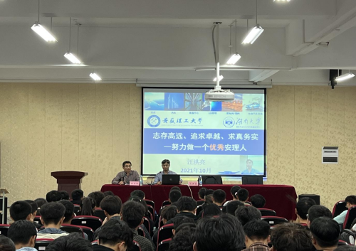 10月14日晚,我校自动化2004届杰出校友,湖南大学博士生导师汪洪亮教授做客百川大讲堂,在励行楼B112报告厅做题为“志存高远、追求卓越、求真务实--努力做一个优秀安理人”讲座,活动同时采取钉钉线上直播,电信学院新生辅导员、全体2021级本科生聆听了报告,报告会由学院党委书记徐关怀主持。