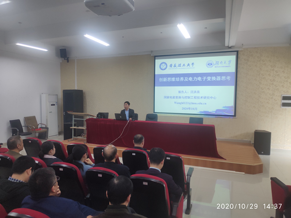 10月29日下午,我校校友、湖南大学汪洪亮教授应学校邀请,在学院学术报告厅作了题为《创新思维培养及电力电子变换器思考》的学术讲座,电信学院近两百名师生聆听了讲座。讲座由学院执行院长周孟然主持。