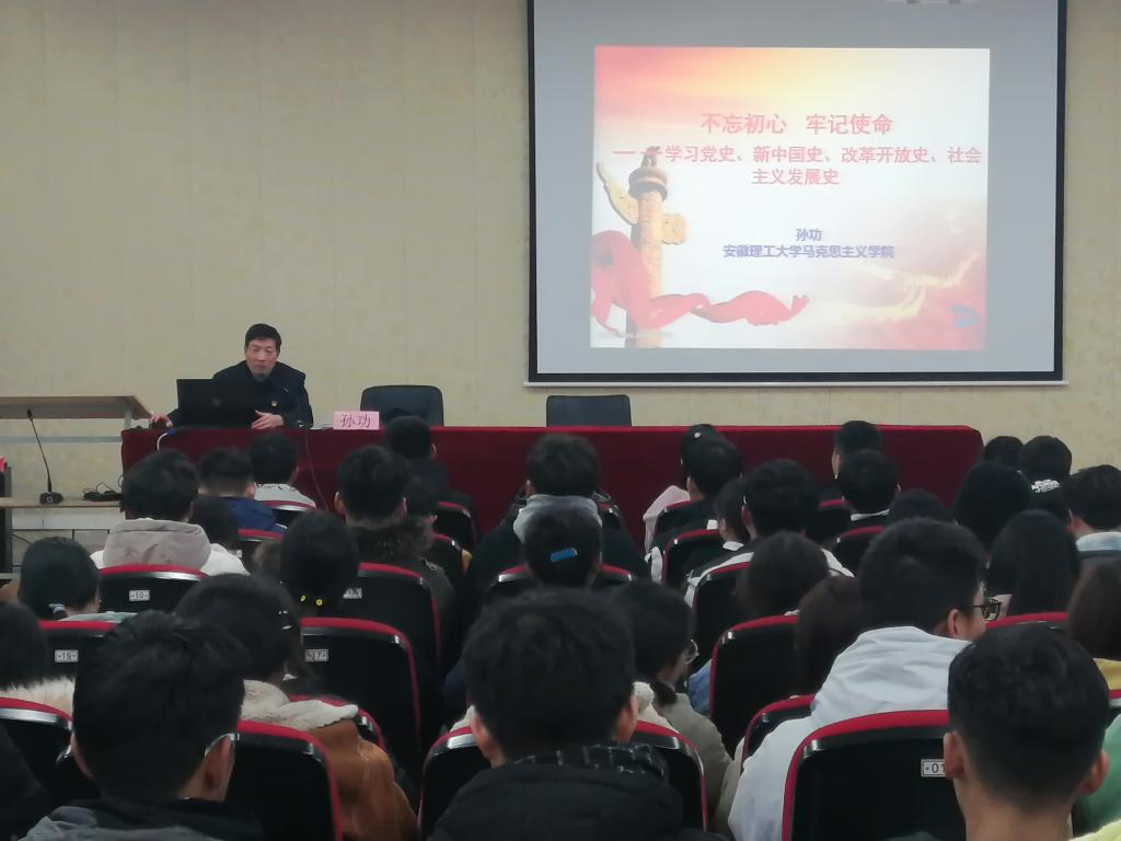 开班仪式结束后,马克思主义学院党总支书记、院长孙功教授为学员讲授《不忘初心牢记使命——学习党史、新中国史、改革开放史、社会主义发展史》专题内容。他从学习“四史”的重要性,“四史”的基本脉络、内在逻辑及根本经验四大方面,给学员们呈现一堂生动的团课,引导学员们立足当下,回望历史,汲取奋进力量。