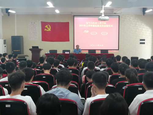 为强化新发展党员的党性意识和党性观念,增强新发展党员的历史使命感和社会责任感,在中国共产党成立100周年之际,6月30日中午,电气与信息工程学院在励行楼B112报告厅组织2021年上半年新发展的158名党员进行集体宣誓,学院党委书记徐关怀及全体辅导员参加仪式,仪式由学院党委秘书乔国通主持。