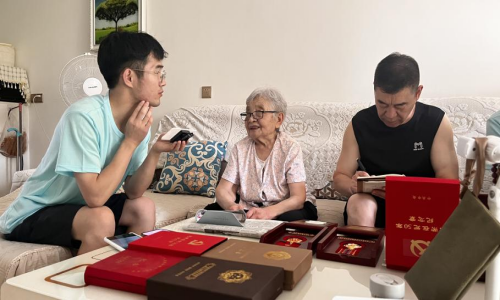 7月7日上午,团队成员在阜阳市区拜访了党龄达74年的老党员肖生同志。今年94岁高龄的肖生老人曾是一名医务兵,参加过抗日战争和抗美援朝战争,为党做出了很大贡献,曾获得“庆祝中华人民共和国成立70周年纪念章”、“中国人民志愿军抗美援朝出国作战70周年纪念章”等勋章。访谈中肖生同志向团队成员讲述了战争中发生的故事,并向团队成员展示了在抗美援朝战争中击落美国飞机后用飞机材料制成的勺子。采访结束后,肖奶奶勉励团队成员珍惜时光,努力学习,毕业后到祖国和人民最需要的地方去贡献才智,建功立业。