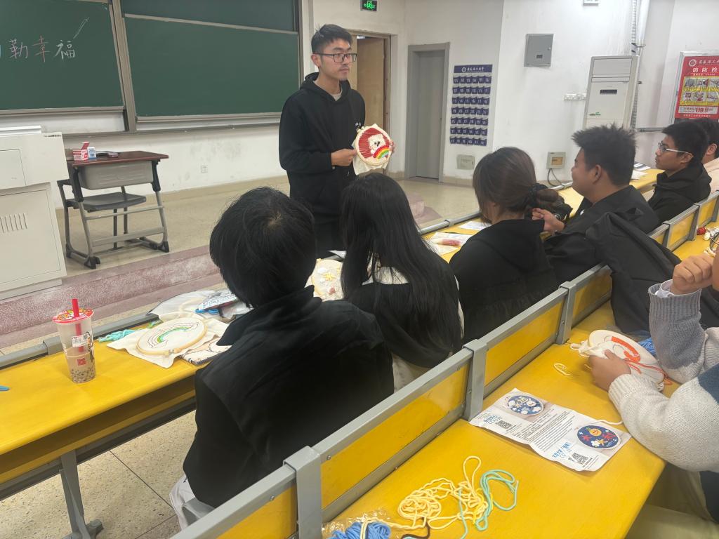戳走烦恼,绣出幸福。为将戳绣画与心理健康相结合,通过简易教学和互动体验,让同学们感受到戳绣画带来的心灵治愈力量,学院于11月30日下午在天工206举行“戳走烦恼,绣出幸福”活动。活动现场为大家详细讲解了“戳戳绣”的绣法风格以及针法技巧。随后同学们换上针头,穿上毛线,戳至布上,将自己的想象力和创造力戳进作品里,细细的戳针也带走了小烦恼,带领大家开启了一段穿针引线的慢时光。最后同学们站在一起,展示自己的制作成果。