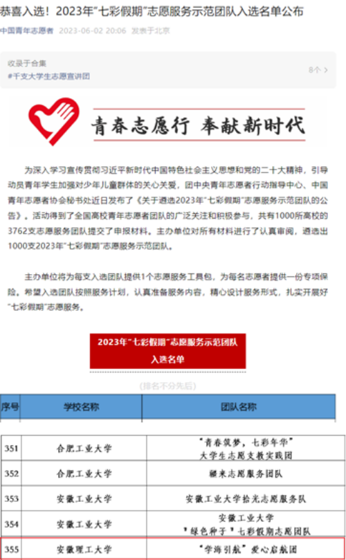 近日,2023年全国“七彩假期”志愿服务示范团队入选名单公布,电气与信息工程学院“学海引航”大学生爱心启航团榜上有名。
