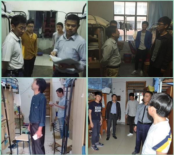 5月3日,学院副院长欧阳名三、祝龙记、虞尚元,党委副书记徐关怀分别带队,对三校区四地学生宿舍、办公室和实验室的安全卫生状况进行了一次全面巡查,学院全体辅导员、办公室和实验室相关人员参与巡查。