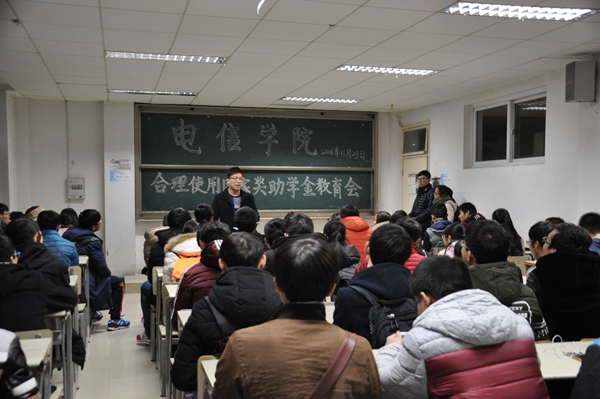 近期,国家奖助学金和校内各项奖助学金正在分批次陆续发放,为引导广大受资助学生合理使用奖助学金,进一步确保奖助学金真正起到奖学助困的效果,11月23日晚上,学院在北3507教室举行了合理使用奖助学金教育大会,学院二至四年级受奖助学生及各班级班长参加了会议,会议由学院学生资助工作联系人衡连伟主持。