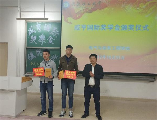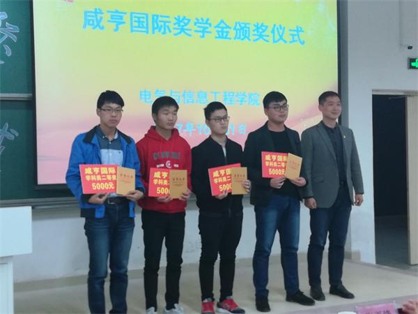据悉,“咸亨国际卓越班”由学院与咸亨国际科技股份有限公司共同开设,根据培养方案和《安徽理工大学-咸亨国际奖学金合作捐赠协议书》的约定,企业在学校设立安徽理工大学-咸亨国际奖学金,其中学科类一等奖学金“咸亨国际卓越班”大三、大四年级每个班各1名,每名奖金8000元;学科类二等奖学金每个班各2名,每名奖金5000元;“研发者大奖”名额不限,符合条件的每个获奖团队5000元。今年共有6人获得以上奖励,其中,2014级徐进文、2015级童国庆2名同学双双获得学科类一等奖学金和研发者大奖,2014级张永康、李腾飞和2015级方华、蒋加豪等4名同学分别获得学科类二等奖学金。