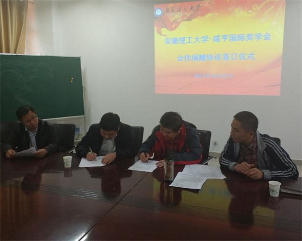 10月31日下午,学院在励行楼415会议室举行安徽理工大学-咸亨国际奖学金合作捐赠签订仪式。咸亨国际科技股份有限公司副总经理张再锋,学院院长李敬兆、副院长欧阳名三、党委副书记徐关怀以及学生辅导员参加仪式。张再锋表达了企业加强与学校的合作和联系、捐资助学的诚意,李敬兆代表学院感谢企业对学校教育事业发展的大力支持,对企业的社会奉献精神给予高度赞赏,校企双方分别在科研合作、人才培养(卓越工程师班)、学生就业等方面进行了深入交流和沟通,达成诸多共识。最后,李敬兆和张再锋分别代表校企双方共同签订了《安徽理工大学-咸亨国际奖学金捐赠合作协议》。