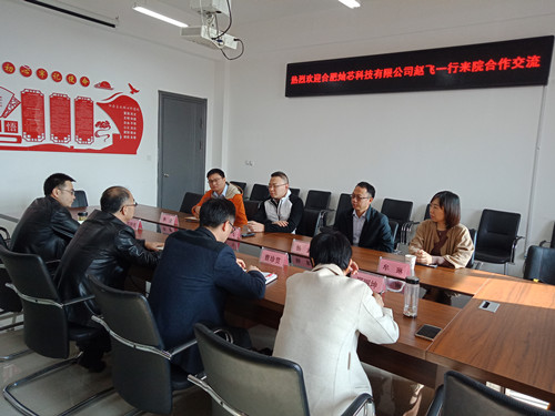 周孟然对赵飞一行的到来表示热烈欢迎,并对学院的人才培养、师资队伍建设、实验室设置以及课程设置情况作了详细介绍,周孟然指出,合肥灿芯科技有限公司在集成电路的设计、研发、加工等方面具有较强优势,希望校企深度联合,共建蜂鸟研发实验室,在课程开设方面共同参与,实现互利双赢。赵飞介绍了目前企业在集成电路方面开展的工作,表示企业正是缺人之际,希望利用贵院人才优势,进行学生联合培养,多向企业输送毕业生,助力企业发展,实现优势互补。最后双方就学生实习、实验室筹建、课程开设等具体事宜进行商谈,达成了初步合作意向。