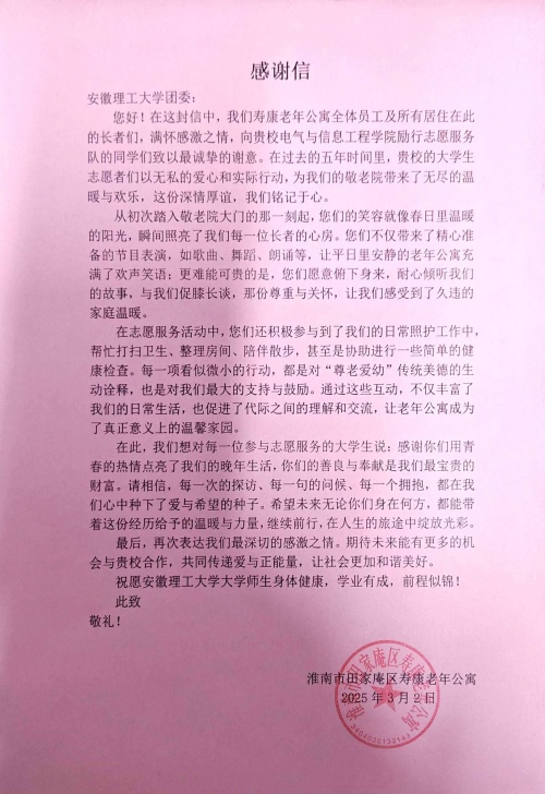 近日,一封满载感激之情的感谢信悄然送达安徽理工大学,这封信来自淮南市寿康老年公寓,深情地表达了敬老院全体成员对电气与信息工程学院励行志愿服务队由衷感谢与高度认可。