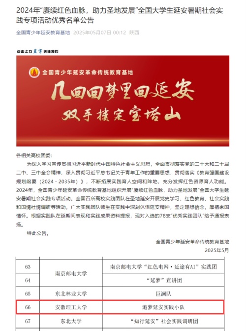 近日,由全国青少年延安革命传统教育基地组织开展的2024年“赓续红色血脉,助力圣地发展”全国大学生延安暑期社会实践专项活动评选结果揭晓,电气与信息工程学院“追梦延安实践小队”获评“优秀实践团队”。